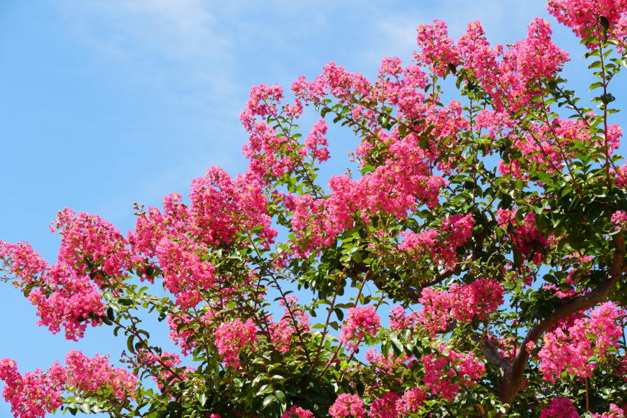 夏の盛りに咲く花は、ピンク、白、紫、赤など、非常に色彩豊かです。花びらはフリルのように縮れており、集合して咲く姿は、まるでブーケのようです。一つの花は数センチと小さいのですが、それが房状になって咲くため、木全体が華やかな色で覆われます。